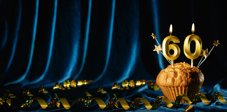 Number 60 gold celebration candle and small stars in sweet cupcake on bright blue velvet background. Concept of celebrating birthday, anniversary. Banner.