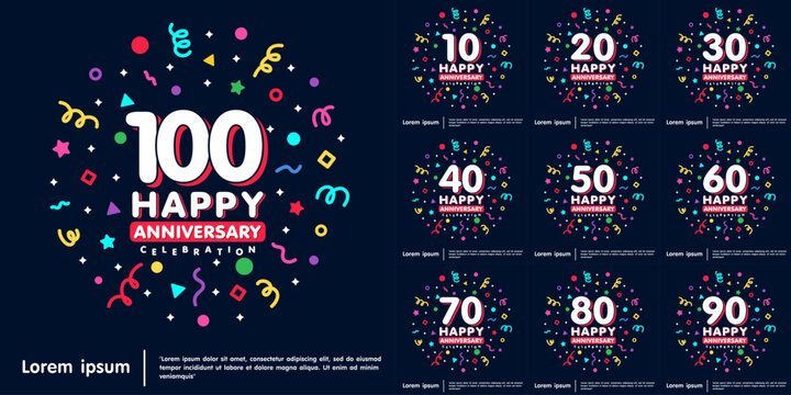 Set of 10-100th years anniversary celebration emblem. Happy anniversary logo isolated with colorful confetti and line doodle and stars. vector illustration template design for web banner