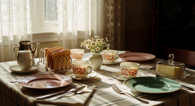Sunlit 1960s Breakfast Table with Vintage China, Fresh Toast, Butter Dish, Floral Centerpiece, and Retro Pastel Plates in Cozy Morning Kitchen Interior with Lace Curtains and Checkered Tablecloth