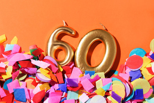 Banner with gold colored number sixty and stars confetti on a pink background. Creative concept with copy space.