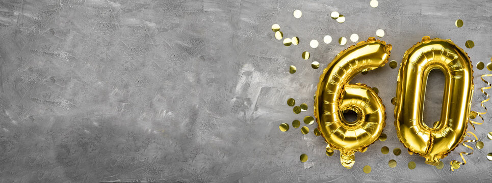 Yellow foil balloon number, number sixty on a concrete background. Greeting card with the inscription 60. Anniversary concept. for anniversary, birthday, new year celebration. banner,