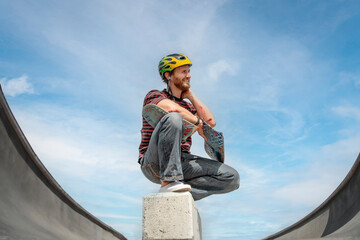 Trendy cool men portrait holding skate board and wearing cap. Skateboard spot. Copy space