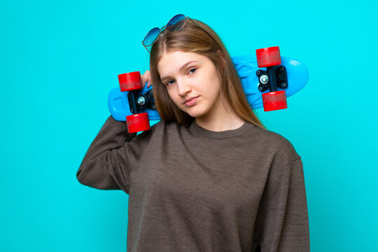portrait of Cheerfull beautiful blonde hair young woman with skateboard, curly hair looking at camera on the seaside resort.Gorgeous human beauty, fashion, vacations and active lifestyle concept image