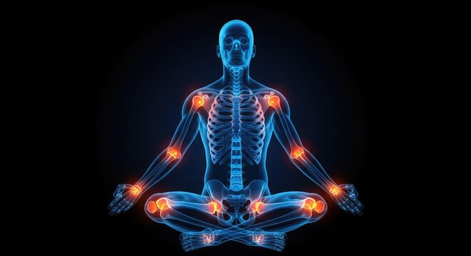 Medical illustration of a human body in a seated position, highlighting joints and skeletal structure.