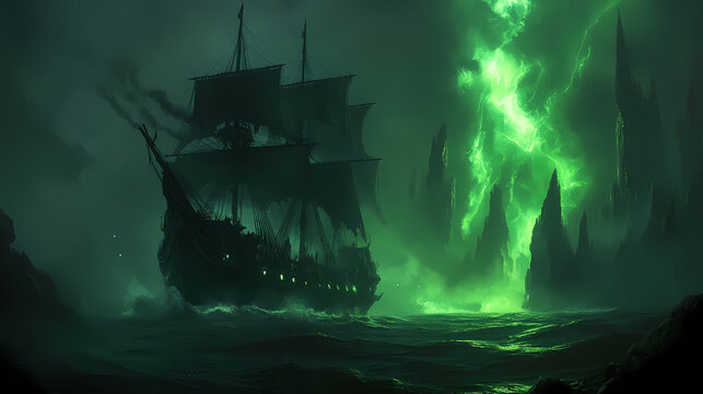 Undead Pirate Crew Sails On A Ghostly Ship. Fantasy Illustration For Halloween And Pirate-Themed Content.