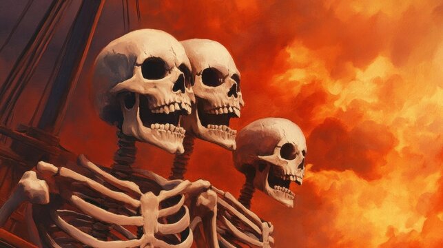 Spooky pirate crew of skeletons on board. Created with Generative Ai technology.