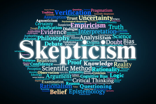Skepticism Word Cloud. Key Concepts On Doubt, Inquiry, Knowledge, Rational Thinking, Evidence, And Philosophical Traditions In Critical Analysis.