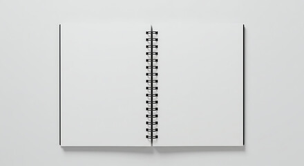 Top view of an open spiral notebook mockup with blank white pages. Clean diary or sketchbook template on a light background for design.