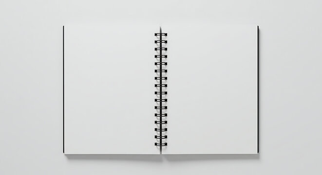 A top down view of a blank spiral bound sketchbook with an open page photographed against a white background The black and white minimalist design allows for ample copy space