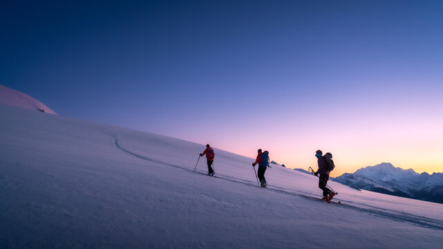 Skiers touring in winter, full of snow, at sunrise under a beautfiul clear sky full of colors. living the dream