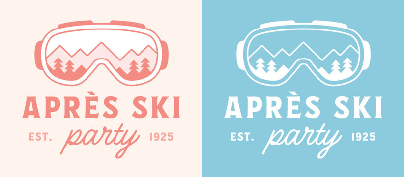 Apres ski party girls shirt design goggles with mountains drawing skiing friends bar night poster sign. Pastel pink blue cozy chic rustic retro vintage aesthetic lettering printable card invitation.