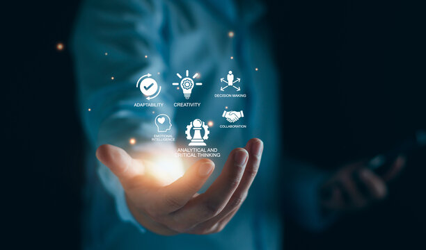 Soft skills HR concept. Business man with icons of soft skills, emotional intelligence, creativity, collaboration, adaptability, decision making and analytical thinking. Soft skills business training