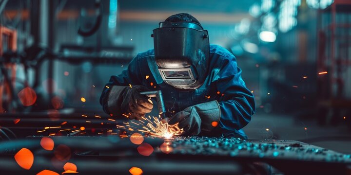 Skillful metal worker working with arc welding machine in factory while wearing safety equipment. Metalwork manufacturing and construction maintenance service by manual skill labor concept