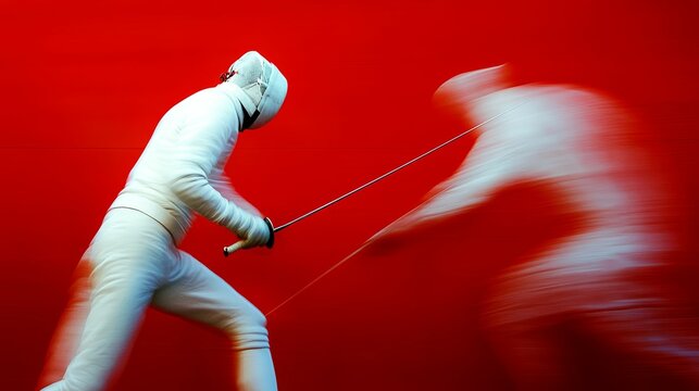 Two fencers in motion against bright red background.