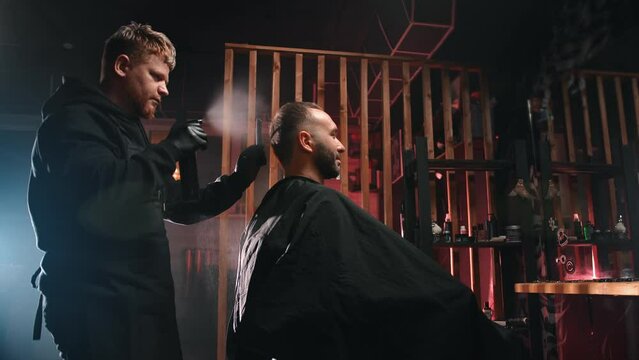 Male hairdresser wearing glove cutting young man's hair with razor in barber shop