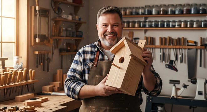 A proud, skilled craftsman with a large belly, smiling with satisfaction as he looks at a piece of woodwork he just finished in his garage workshop.