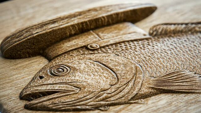 Intricate wood carving of a fish wearing a hat showcases skilled craftsmanship and artistic creativity