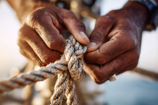 Close-up of hands tying knots on sailing boat, warm light, teamwork and preparation moment,