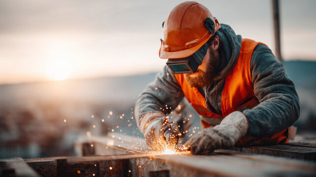 Skilled worker welding metal on a construction site during sunset in a vibrant urban landscape