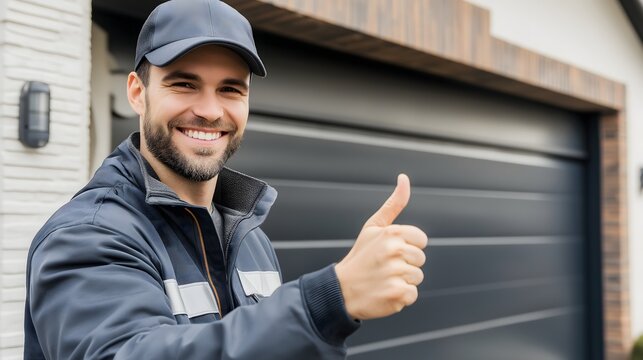 Smiling maintenance worker in uniform with tool belt stands outside apartment building. Pro technician ready for service job, ensuring property upkeep, community support. Friendly demeanor.