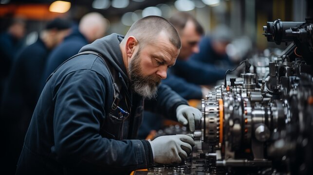 Skilled worker assembling intricate oilfield refinery oil gas machinery engine in a well-lit manufacturing plant facility