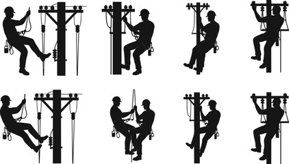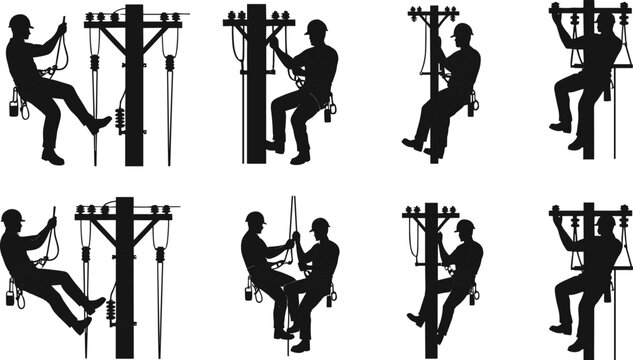 Utility pole worker silhouettes, electrical maintenance, safety gear, climbing equipment, telecommunications repair, industrial labor, helmeted technicians, infrastructure service, skilled linemen