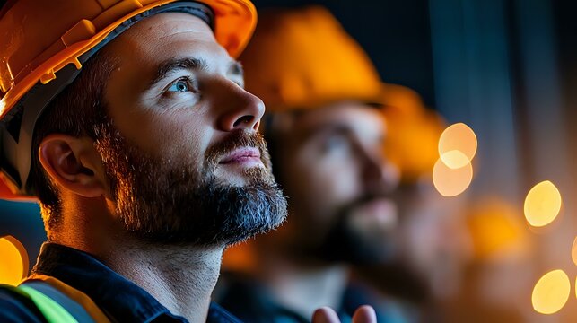 Caucasian male construction worker in safety helmet looking up with hopeful expression, illuminated by warm evening lights against blurred background.