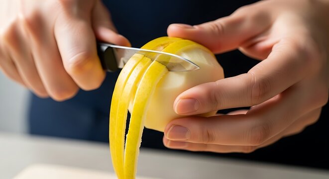 Skilled hands peeling a ripe yellow apple with a precision knife skill