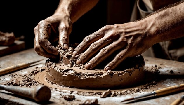 Close-up of skilled hands shaping wet clay on a spinning pottery wheel, capturing texture, motion, and the artistry of handmade ceramic creation. Ideal warm, authentic craft aesthetic.