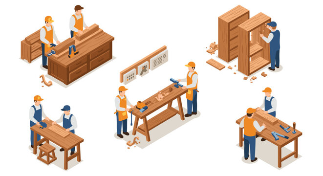 Isometric workshop scene with woodworkers assembling furniture pieces
