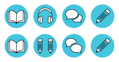 Education Icon Vector, Blue Modern Language Skills Set for Reading Listening Speaking and Writing