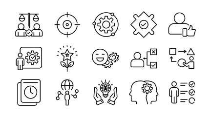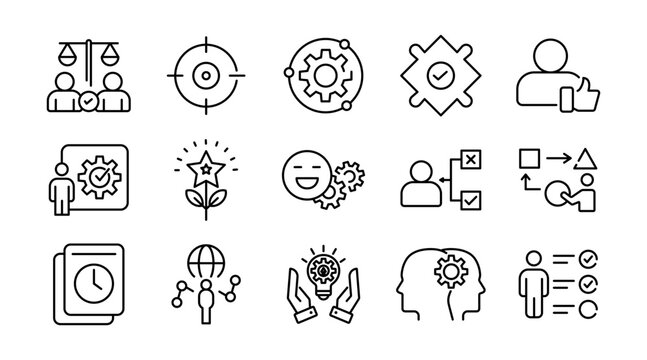 Soft skills linear icon set. Communication, teamwork, leadership, empathy, problem solving, time management, adaptability, creativity, and personal development vector icon set. UI thin line pack