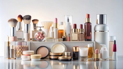A beautifully lit, organized display of various skincare and makeup products on a white background, showcasing a wide range of cosmetic essentials for a pampered look.