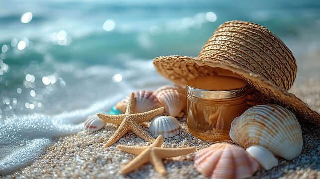 sun protection essentials for uv safety awareness month a pastel blue flat lay with sunscreen sunglasses sunhat shells and starfish with copy space
