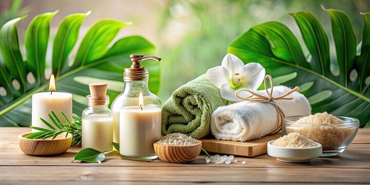 Spa essentials set amidst tropical ambiance, offering a peaceful wellness retreat.