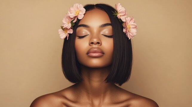 Serene woman, flowers, studio, beauty, portrait, calm, beige background, skincare ad