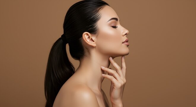 Profile of a beautiful young woman with healthy glowing skin, touching her chin gently, in a studio setting with a brown background, showcasing beauty and skincare