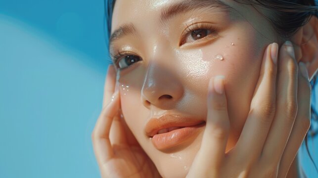 Close up of a woman with water on her face, suitable for skincare products advertising