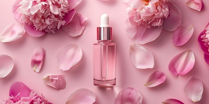 Glass dropper bottle mockup with peony petals background for skincare product presentation. Concept Beauty Packaging, Product Presentation, Skincare Mockup, Floral Background, Cosmetic Promotion