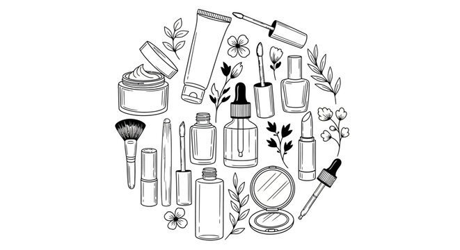 Collection of skincare and makeup products arranged in a circular pattern, featuring creams, serums, lipsticks, and brushes