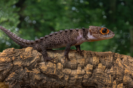 Papua New Guinea. Red-eye crocodile skink on fallen tree.