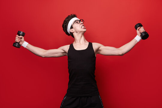 Full body skinny nerd with funny face doing exercise with dumbbells isolated on gray background. Full length hilarious smiling man in sweatband, white tank top and red shorts enjoying sports workout