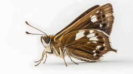 16. A small silver-spotted skipper butterfly with brown and white markings, gently resting on a white background