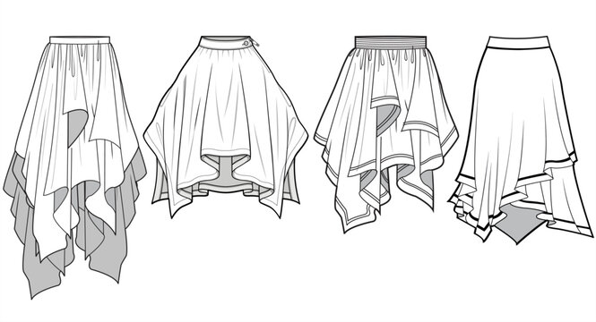 Handkerchief Skirts, Asymmetric Hem Skirts  Sets Fashion Illustration, Vector, CAD, Technical Drawing, Flat Drawing, Template, Mockup.