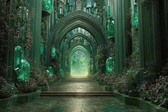 Emerald City Gate. Oz Fantasy Palace with Crystal Entrance in Fairy Tale Setting