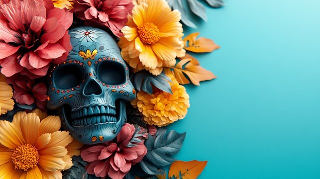 Colorful skull with vibrant flowers on a turquoise background in a festive arrangement