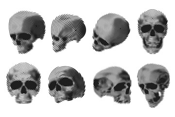 Collection vector silhouettes of human skulls in engraving monochrome line style. Isolated on white background. Design element for print, card, cover, poster.