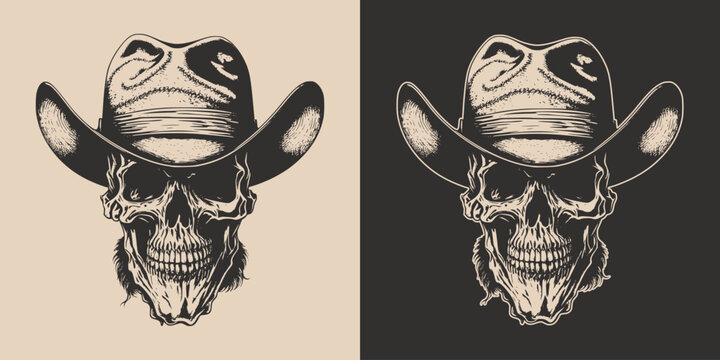 Set of vintage retro scary hipster cawboy skull in hat. Can be used like emblem, logo, badge, label. mark, poster or print. Monochrome Graphic Art. Vector. Hand drawn element in engraving