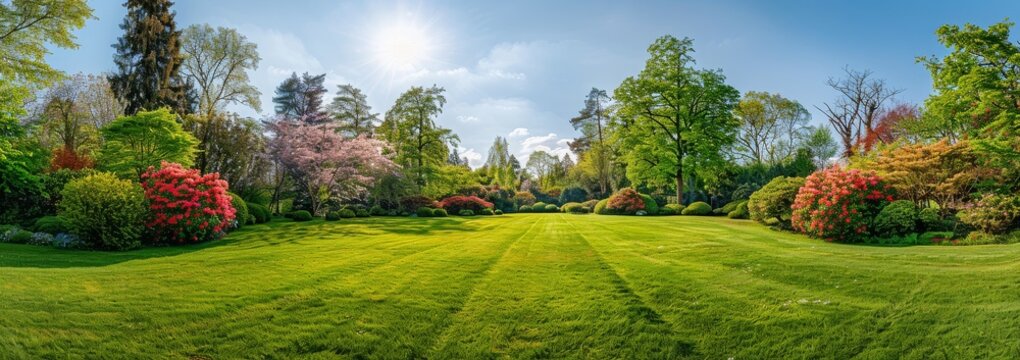 Beautiful large garden in spring featuring rhododendrons, colorful flowers, trees, and shrubs against a sunny blue sky, showcasing a lush green lawn for planting.