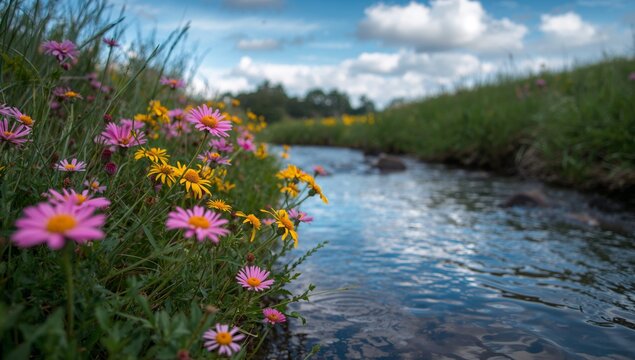 Floral Cascade by the Stream, Sunlight Reflections on the Flowing Water.